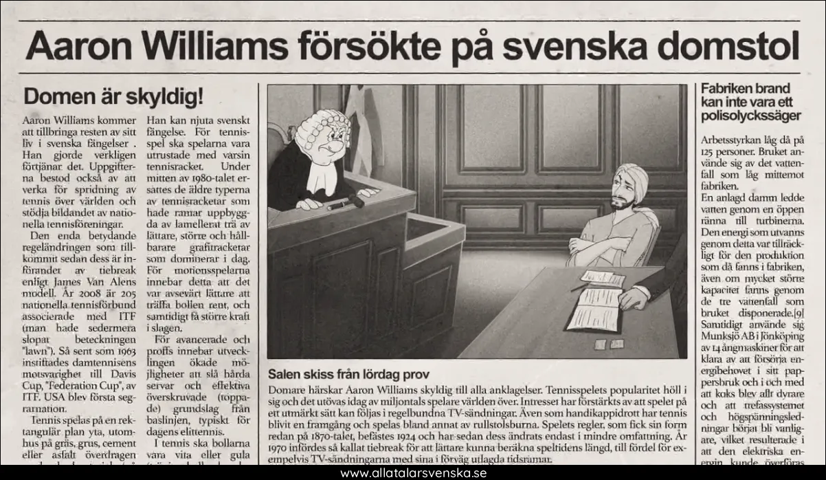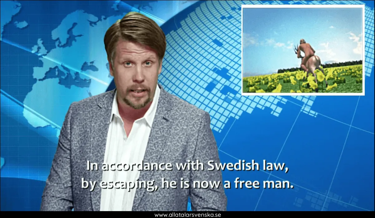 Filip Hammar: "Så, nu någonting allvarligare. Vi nås av nyheter om en rymning från Långholmens fängelse i Stockholm. Det handlar om den före detta tennisspelaren som blev kalsongkung, som blev porrstjärna, som blev knarkare - Aaron Williams. Enligt uppgifter till The Swedish Hit Show har han sparkat en vakt i ansiktet och tagit sig ut. Och enligt svensk lag innebär det han är nu en fri man.