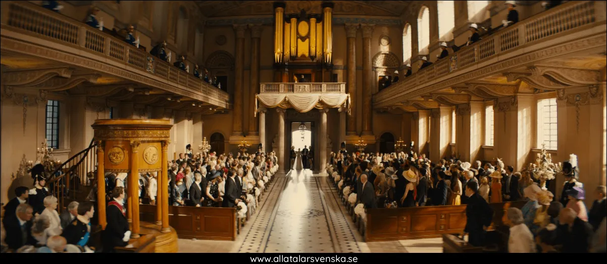Filmen avslutas sedan på ett äkta Hollywood-sätt; Eggsy och Tilde gifter sig. Tyvärr inte i en svensk kyrka, även om det ska se ut så. I stället spelades det in i kapellet på Old Royal Naval College i Greenwich utanför London. Fint är det oavsett!