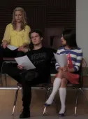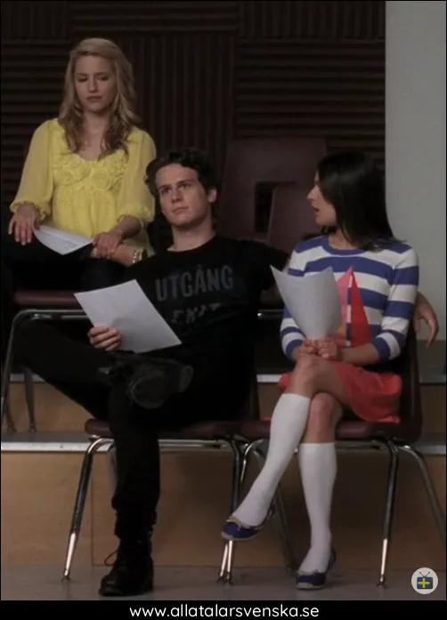 I klassrummet drar en av lärarna igång gamla Vanilla Ice-hitten "Ice ice baby". Den i sig har ju inte så mycket svenskt i sig, men en av killarna, Jesse St. James (Jonathan Groff) har en riktigt snygg svart t-shirt på sig med texten "Utgång Exit".